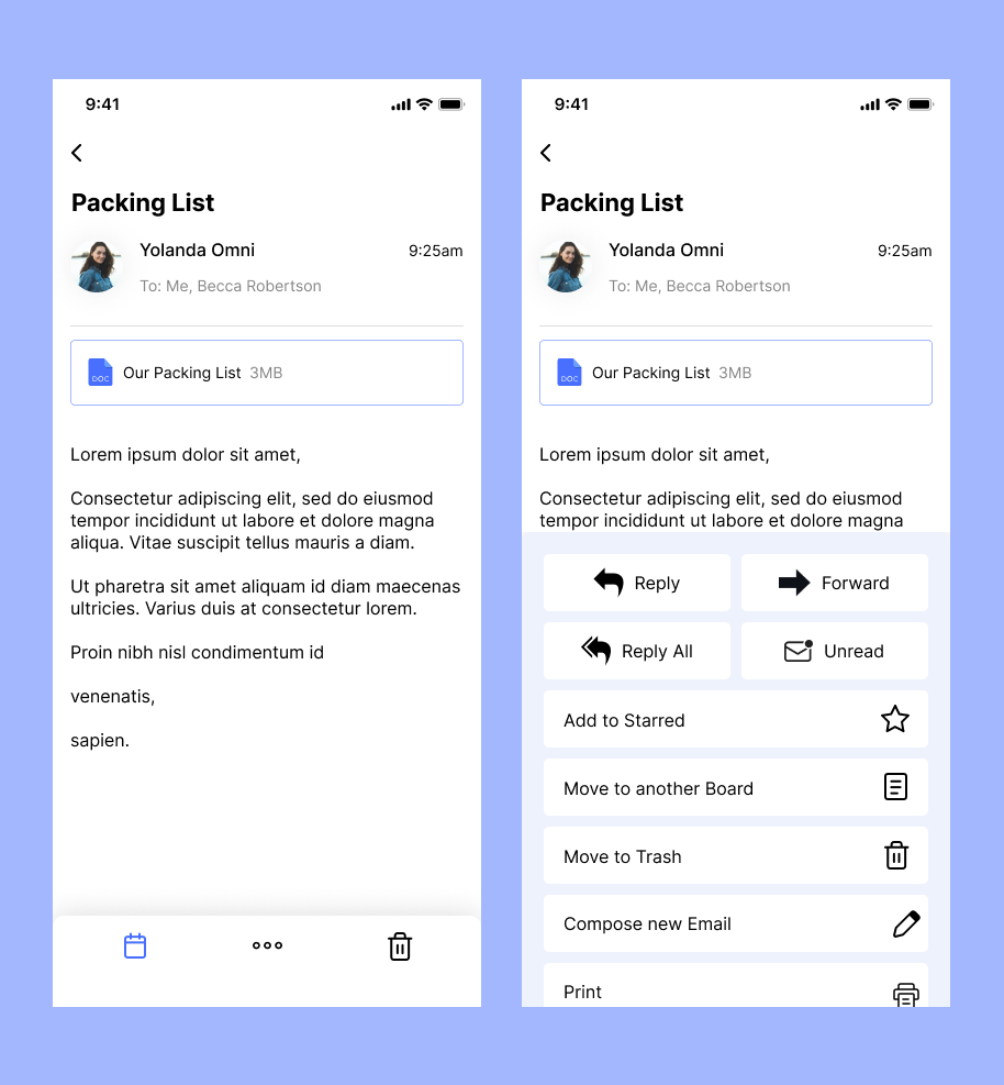 Ideally, users should be able to read and move their emails to different boards just from the preview. Most email apps used the hamburger menu to switch emails between categories, but we wanted to design something thats newer and faster. I created many sketches and design variations to figure how users could scroll between boards to view them while also drag & drop emails into them.