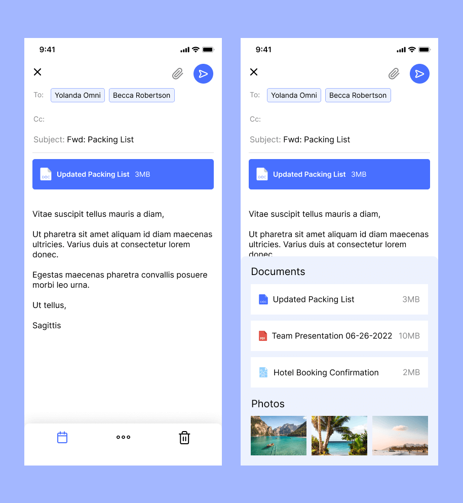 Having an interface that is easy to navigate and complete tasks is one of the main goals for this project. This user flow contains the onboarding process when users first sign into the app and demonstrates how easy it is to add attachments to a forwarded email, which is a task users in the focus group shared is frustrating to complete with existing email mobile apps.